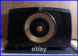 VINTAGE 1950S RCA VICTOR BROADCAST RECEIVER Tube RADIO MODEL 67QR53W. Tested only for powering on, no other functions tested, cabinet has some chipping as shown. Superheterodyne (common); ZF/IF 460 kHz; 2 AF stage(s); Export model. Broadcast plus 2 Short Wave bands. Power type and voltage. Alternating Current supply (AC) / 110; 127; 150; 180; 220 Volt. Permanent Magnet Dynamic (PDyn) Loudspeaker (moving coil) / Ø 13 cm = 5.1 inch. RCA RCA Victor Co. Tablemodel with Push Buttons.